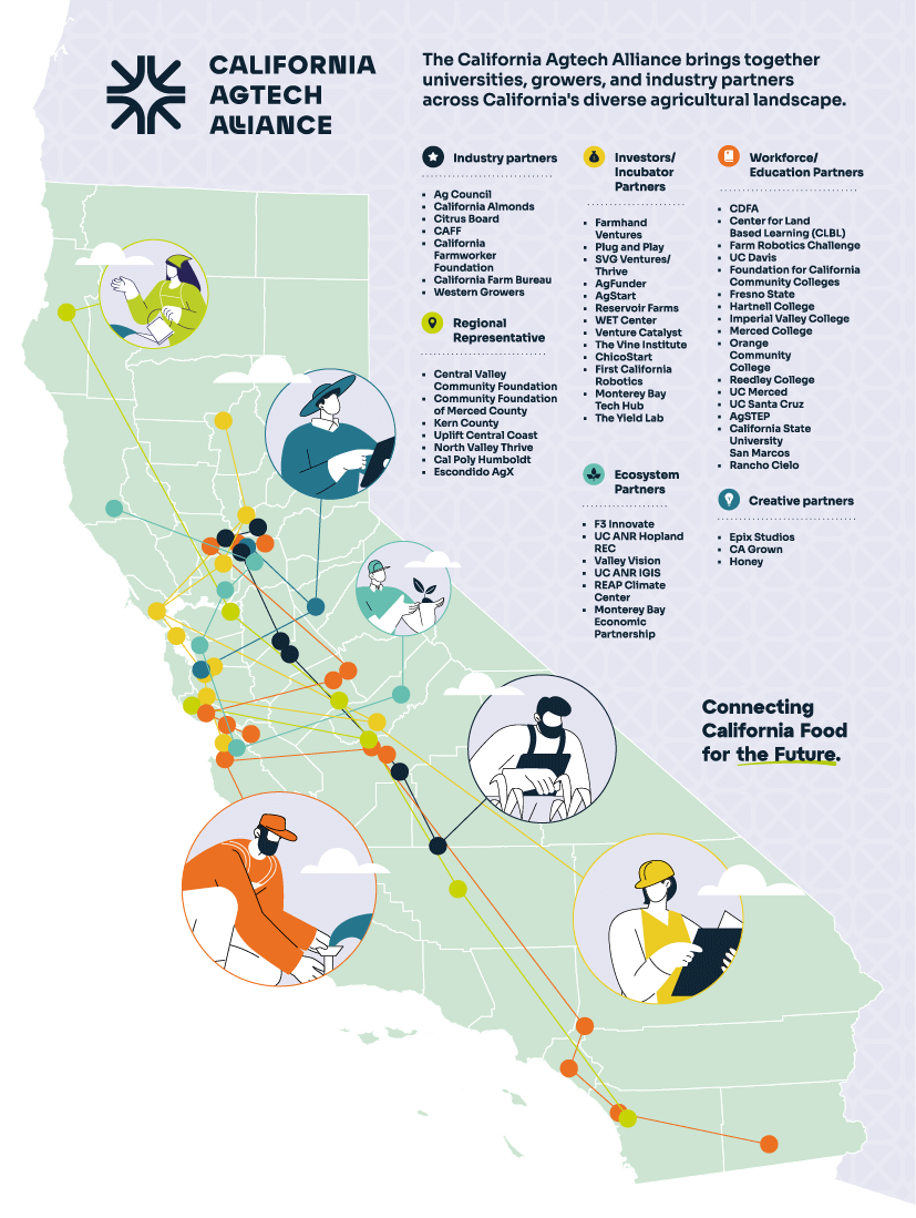 The California AgTech Alliance unites nine regions, hundreds of innovators, and thousands of workers to build the world’s most inclusive and climate-smart agricultural innovation ecosystem.